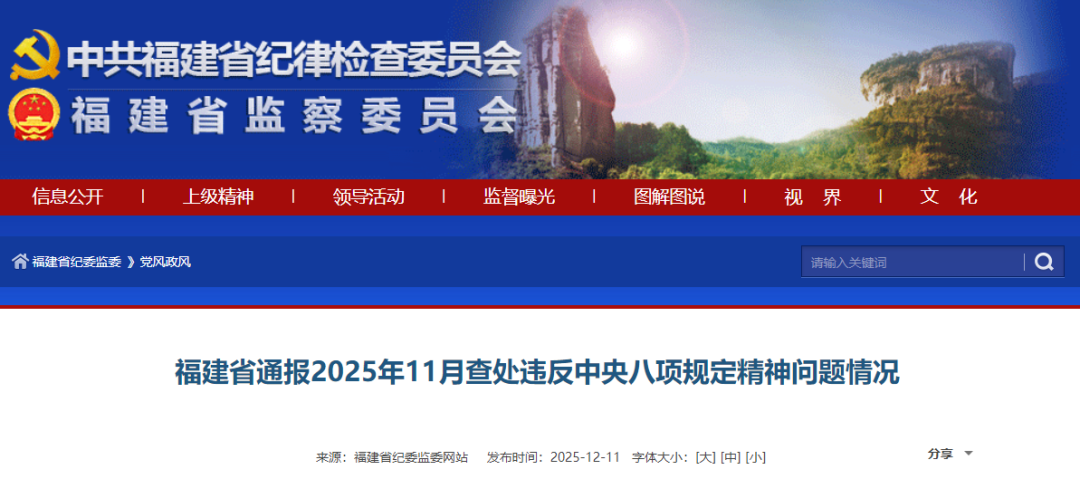 2025年11月,福建省查處違反中央八項規定精神問題1078件,批評教育和處理1255人,給予黨紀政務處分918人。福建省2025年以來查處違反中央八項規定精神情況如下: